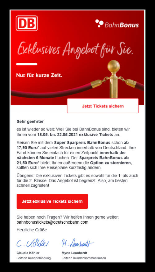 Am 18. Mai startete die Bahn eine Emailaktion für Teilnehmer am BahnBonus-