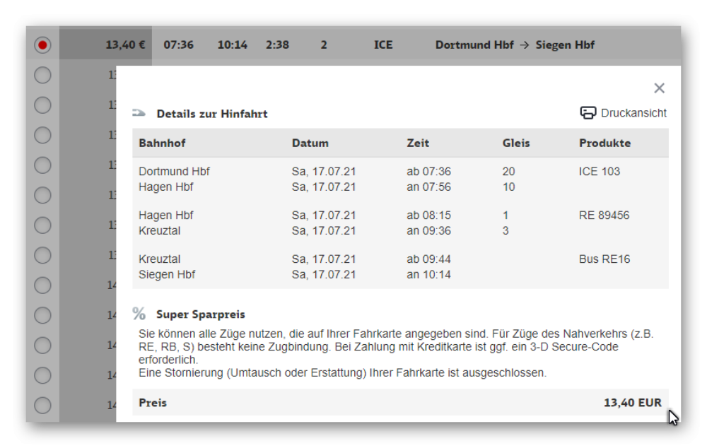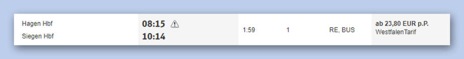 Nach dem Klick auf Suchen wird das Ergebnis angezeigt. Nun kennen Sie den Preis für das normale Nahverkehrsticket.