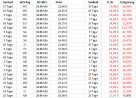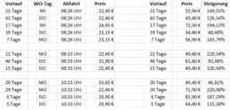Verlauf der Preise in den letzten 22 Tagen vor Abfahrt zeigen. Die schwarzen Felder zeigen die Erhöhung