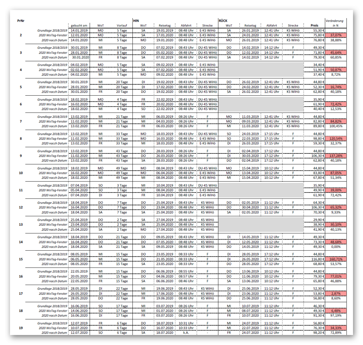 auch zu spezifizieren. Ziel war es, Fahrten mit den Zügen, Reistagen und Buchungszeiten 2018 und 2019 mit den