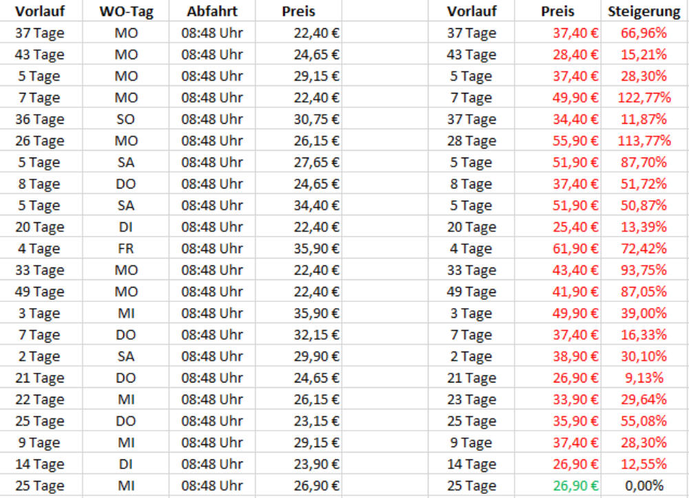 Sparpreise einer Zugverbindung ändern sich im Laufe von 100 Tagen vor dem
