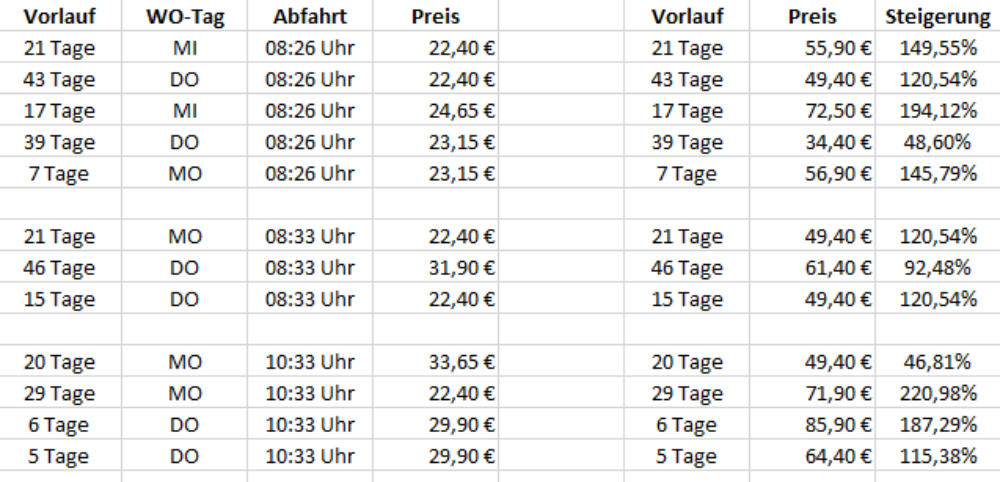 gleichen Reisetagen, gleicher Vorlaufzeiten und gleichen Buchungstagen zeigte sich, dass nicht eine Verbindung